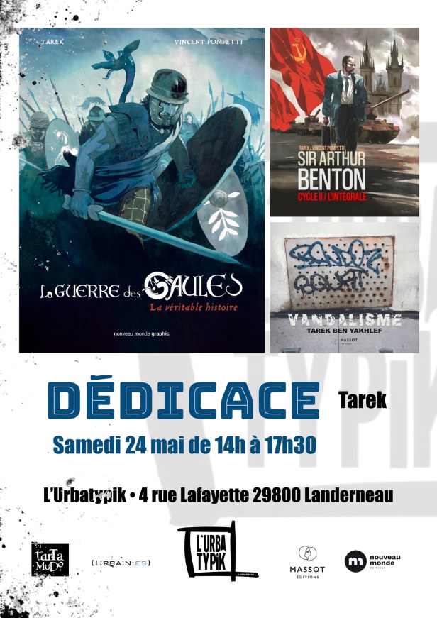 Tarek sera présent à la galerie L’Oeil Ouvert (1 rue Lucien Sampaix 75010 Paris) du 3 au 4 juillet pour dédicacer son dernier ouvrage VANDALISME chez Massot éditions ainsi que ses livres dans le Label Urbain-es et certains de ses albums BD chez Tartamudo Editions.
