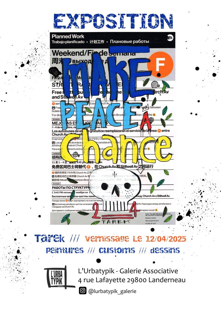 Rendez-vous chez Friches et Nous la Paix – 16 rue Denoyez, 75020 Paris (métro Belleville) : Du 21 avril au 14 mai avec un vernissage le 25 avril dès 17h.